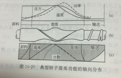 混煉主要起到分布混合的作用;而碾磨主要起到分散混合的作用。圖10-20中的(a)圖表示混煉功率,混煉溫度和混煉壓力沿螺桿軸向的分布情況。可見,在轉子反向螺紋的交匯點靠近進料口的位置,也就是熔體物料同時發生熔化、混煉和碾磨的區域,壓力、溫度和功率均達到最大值。